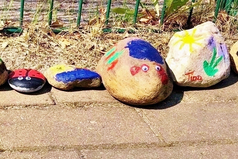Für alle sichtbar liegen diese kleinen Figuren ab jetzt - aufgereiht in einer steinernen Schlange - direkt am Eingang zur Kita. Vielleicht regen die bunten Gesichter nun auch spazierende Nachbarn oder vorbeitollende Kinder an, weitere Steine in fantasievolle Wesen zu verzaubern und in die farbenfrohe Sammlung einzureihen? Der Fantasie sind keine Grenzen gesetzt …