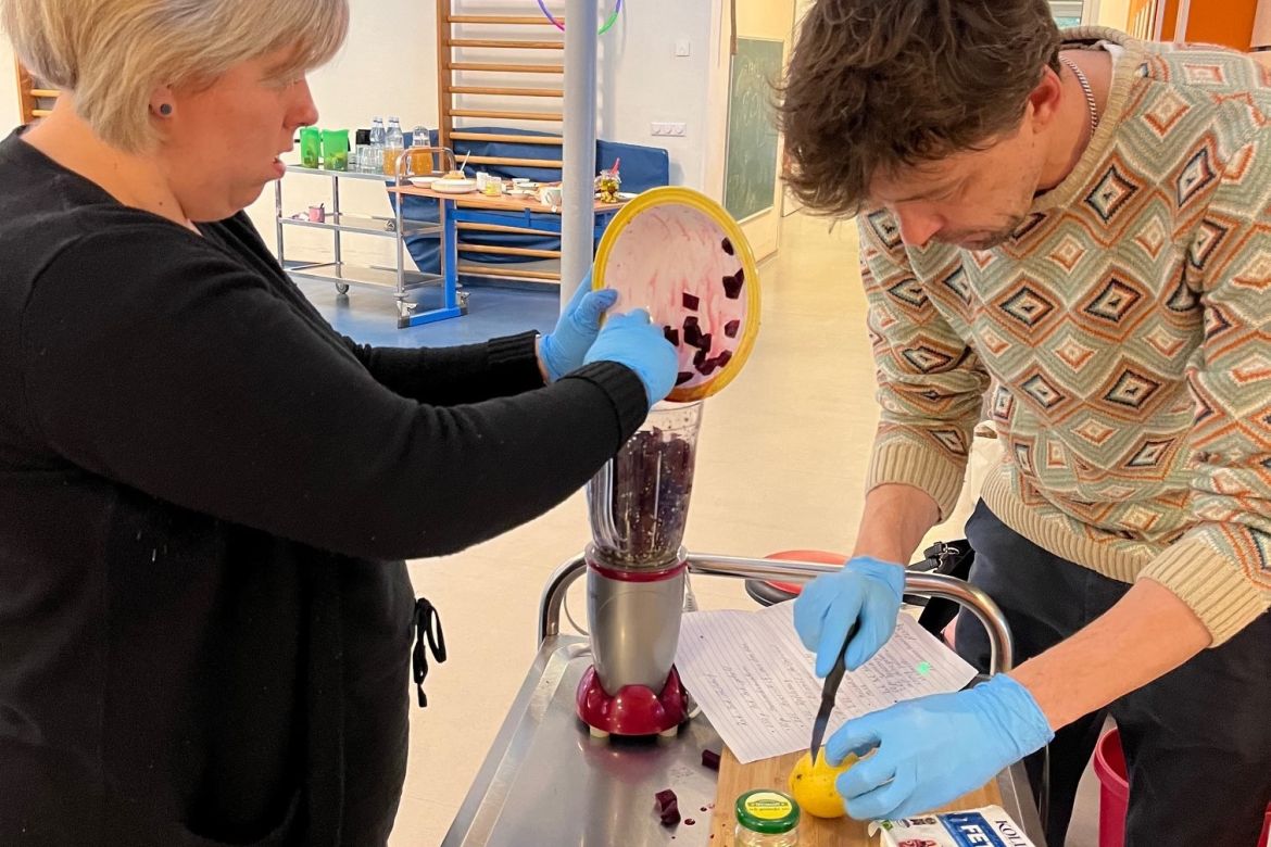 Diesmal beschäftigte sich unser Team vor allem mit Kräutern. Ihre Verwendung und Wirkungen auf die körperliche Befindlichkeit der Menschen stand auf der Tagesordnung. In gemeinsamer Runde entstanden gesunde Aufstriche wie eine Tomaten-Kräuter-Butter oder ein Rote-Beete-Aufstrich. Aus Früchten, variiert mit Kräutern, wurden Tees aufgegossen. Selbst für die Pflege der Haut gab es Nützliches: Aus Bienenwachs und Rosenblütenextrakt entstand unter flinken Fingern ein naturkosmetischer Lippenbalsam.